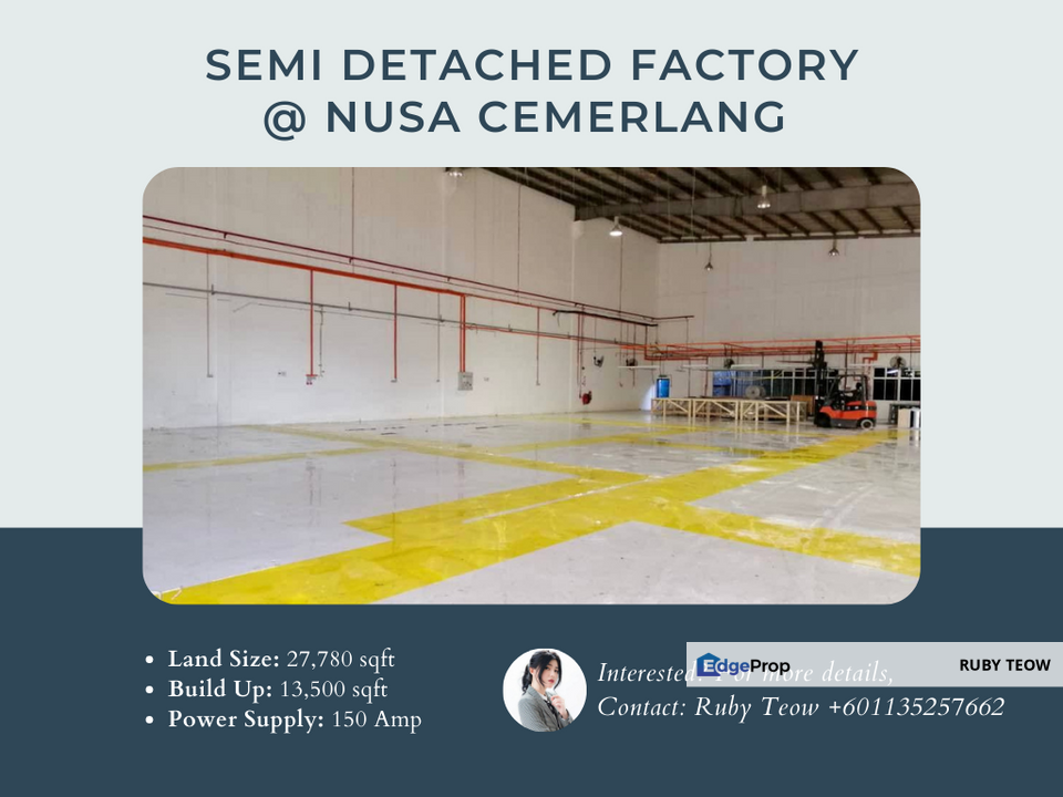 Taman Perindustrian Nusa Cermelang Gelang Patah Johor - Semi Detached Factory - 15 storey - Land area - 15013sqft - Built up - 13000sqft - Production area 11900sqft - 1st floor build up 1600sqft - Power supply - 200amp - Medium Industrial - Large parking space Rental Rm12k negotiable Please contact Kev0165867974. 29 Jalan Mega 14 Taman Perindustrian Nusa Cemerlang Gelang Patah Johor Malaysia. Featuring a complete list of amenities guests will find their stay at the property a.