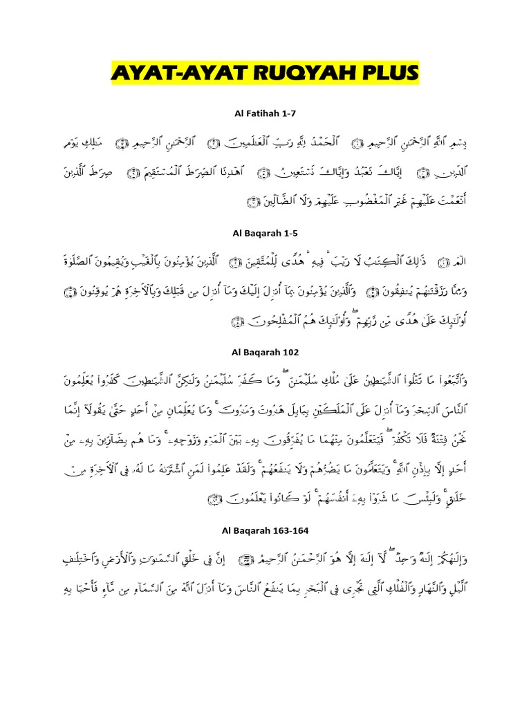 Al Imran 18-19. 8102019 AYAT-AYAT RUQYAH PLUSpdf 16AYAT AYAT RUQYAH PLUSAl Fatihah 1-7Al Baqarah 1-5Al Baqarah 102 Al Baqarah 163. Kitab e-Teuhid i Plotepdf.
